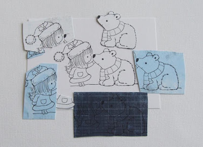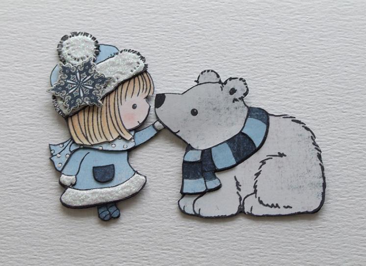 Trim pieces of the stamp with scissors or a craft knife and assemble. Add glitter to Mimi’s hat and coat trim