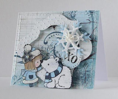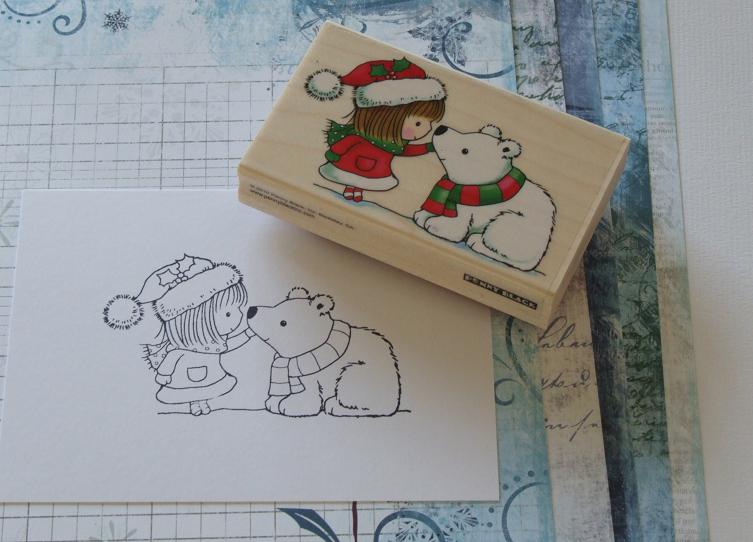 Supplies: Penny Black Snow Kiss stamp, white cardstock, black ink, coordinated patterned papers, dimensional adhesive, pergamano scissors, die cuts, greeting sticker or stamp.