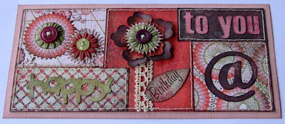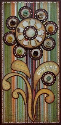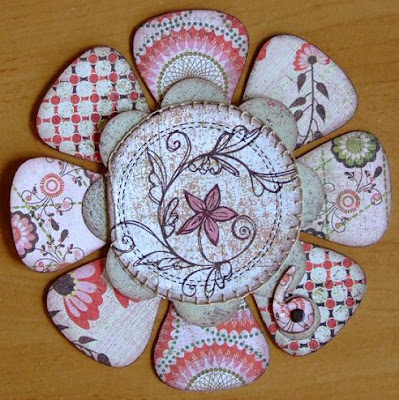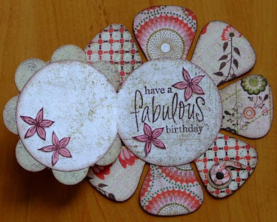 Brads, lint, flowers, acryl verf, knopen en een roze inktblokje.